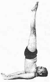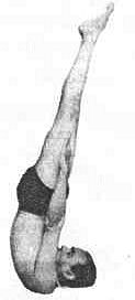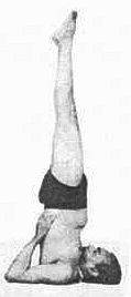 Хотя, при наличии искусственной площадки, можно поднять туловище в «свечу» достаточно быстро, не следует этого делать. Выпрямляйтесь вверх не спеша, чтобы не ощущать в лице, ушах, глазах ощутимого перепада давления крови. Какое-то время можно побыть в форме на рис. 57, несколько секунд, затем — на рис. 58, потом — на рис. 59 (все это промежуточные фазы «Сарвангасаны») и уже затем полностью выпрямиться в позу на рис. 6.