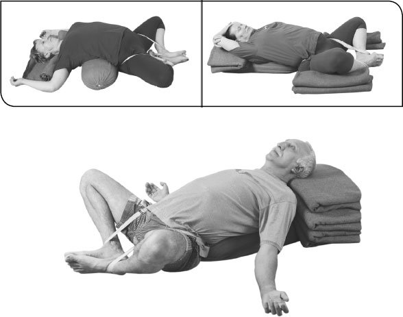 Сядьте в Баддха конасану на край валика (или на несколько сложенных в длинную полоску одеял). Если у вас есть ремень, накиньте его на область крестца и под внешние края стоп. Затягивая ремень, приблизьте стопы к туловищу так, чтобы пятки оказались на расстоянии 5–10 см от промежности. Если ремня нет, упритесь пальцами ног в стену. Сползите вперед и сядьте на пол перед валиком. На выдохе лягте спиной на валик, оставляя ягодицы на полу. Под шею и голову подложите небольшое одеяло. Раскройте грудную клетку в стороны от центра, опустите плечи вниз. Вытяните руки в стороны, разворачивая всю внутреннюю поверхность рук к потолку, и полностью расслабьте руки. Закройте глаза и дышите, наблюдая за постепенным естественным удлинением дыхания, расслаблением тела и успокоением ума. Останьтесь так в течение 5–8 минут. Затем откройте глаза и сядьте, отталкиваясь руками от пола.