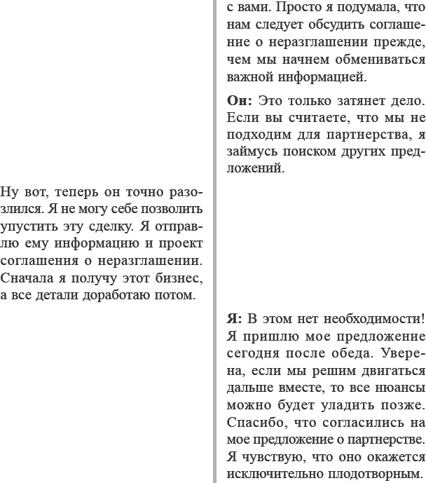 Анализируя отредактированный диалог, Фрида сказала, что настаивать на своем ей было неловко, но, с другой стороны, у нее возросла уверенность в своей силе. Она предположила, что если бы во время реальной встречи заняла такую позицию, то партнер, вероятно, подписал бы соглашение о неразглашении, чтобы продолжить изучение потенциальной возможности. Фрида знала, что освоение этого навыка потребует практики, но дала себе слово, что в следующий раз, когда окажется в подобной ситуации, будет сохранять твердость в важных вопросах.