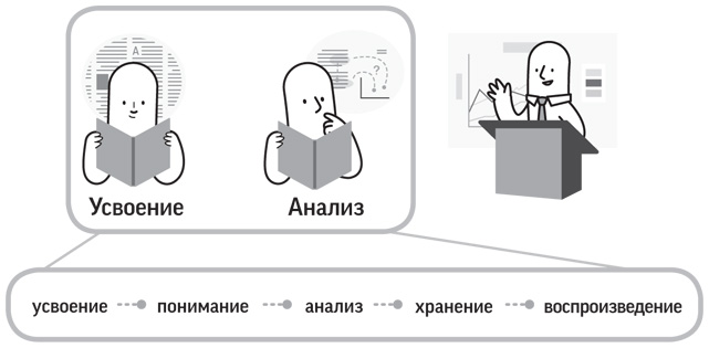 Я уже говорил о трех этапах обработки информации: усвоение, анализ и применение. Проанализируем первые два: усвоение и анализ. Их можно разделить на пять шагов: усвоение, понимание, анализ, хранение, воспроизведение. Каждый из этих шагов преследует свои цели, но они тесно связаны друг с другом и в некотором смысле пересекаются.