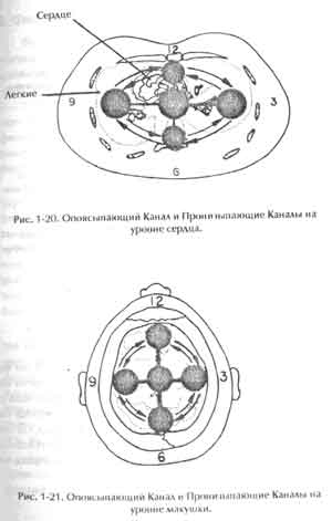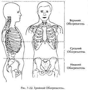 Тройной Обогреватель - понятие, отсутствующее в западной медицине. Однако, согласно даосским представлениям, по своей природе он - Ян и состоит из трех частей. Его верхняя часть включает в себя голову, сердце и легкие. Средняя часть включает пищеварительную систему, а нижняя - почки, часть кишечника и репродуктивные органы (рис. 1-22). Китайцы считают, что Тройной Обогреватель связан с гипоталамусом - частью мозга, которая отвечает за основные жизненные функции организма, включая чувство голода, поддержание температуры тела и равновесие жидкостей в теле. Ци Нэйцзан помогает настроить Тройной Обогреватель, приводя в гармонию три его части и тем самым поддерживая его в хорошем рабочем состоянии.