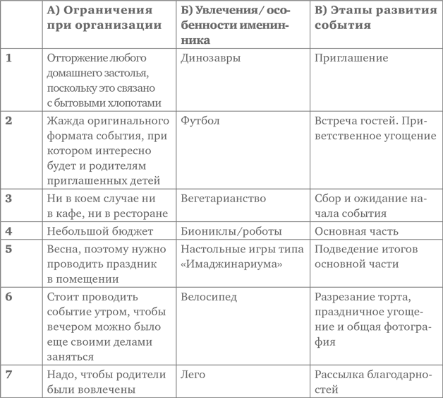 Теперь посмотрите, как те же параметры при небольшой корректировке формулировок помогут мне в достижении моей цели — празднования пятилетия моего сына и решении проблемы — ограниченного бюджета на организацию торжества.