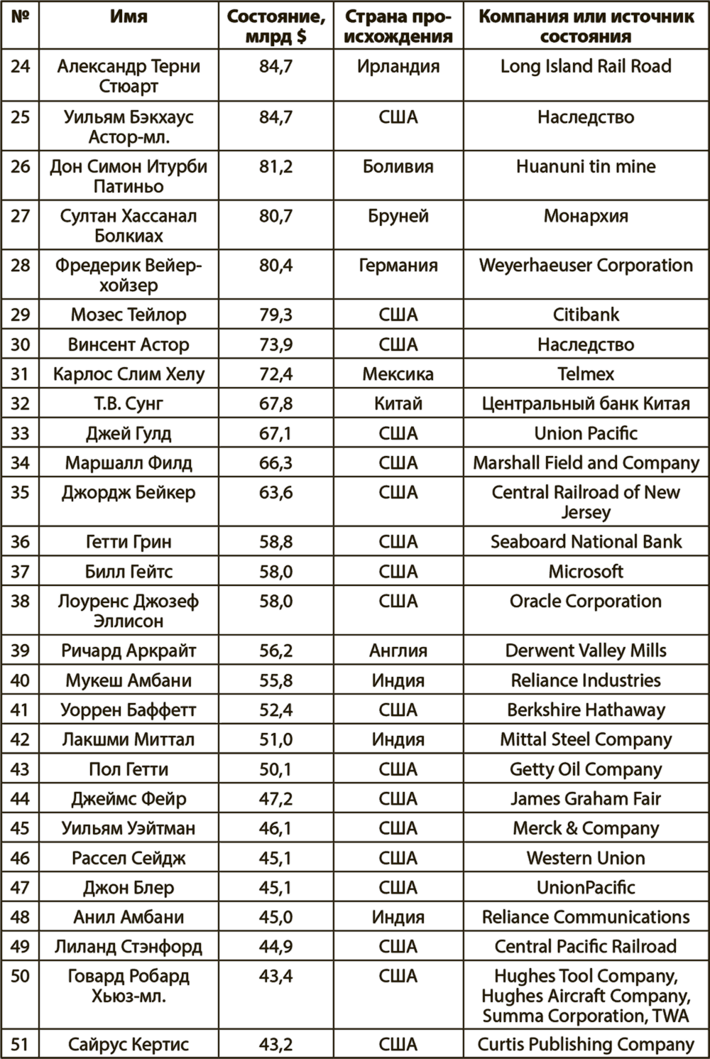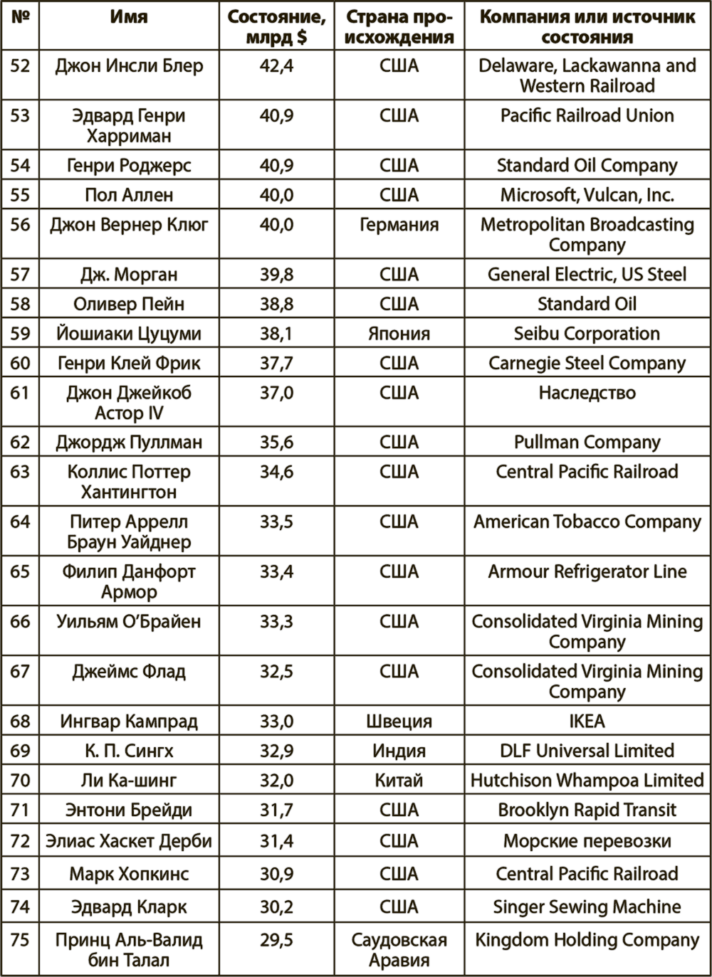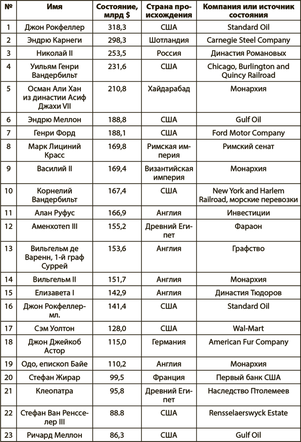 И напоследок еще один пример. Проведем календарный анализ наподобие того, что был в конце предыдущей главы, только на сей раз нас интересуют не месяцы рождения, а годы. Внимательно ознакомьтесь со списком 75 самых богатых людей в истории человечества, который недавно составил журнал Forbes. Состояние каждого из них оценено в долларах США с учетом их текущей покупательской способности. В список включены королевы, короли, фараоны минувших веков, а также миллиардеры современности, такие как Уоррен Баффетт и Карлос Слим.