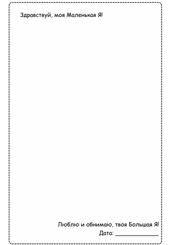 Возьмите ручку. Вспомните период, когда вы были совсем маленькая. Вспомните грустный момент, который до сих пор остался в вашей памяти. Поддержите малышку и напишите ей письмо! Расскажите, что ситуация над которой она грустит, не стоит её слёз, как важен её путь, сколько она добьётся к вашим годам, сколько побед будет на её пути, сколько прекрасных моментов она переживёт в своей жизни. Расскажите, какой прекрасной, удивительной она станет! Расскажите и о том, как сильно вы её любите, как она нужна вам!