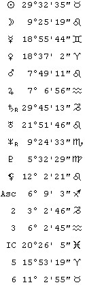 Уран в VIII доме, II и VIII. Формально это II - VIII, но все-таки связь есть. Уран 120° с Венерой, II + VIII. Уран 90° с Солнцем, II - VIII. Уран 60° с Меркурием, II + V (дважды) и V + VIII (дважды).