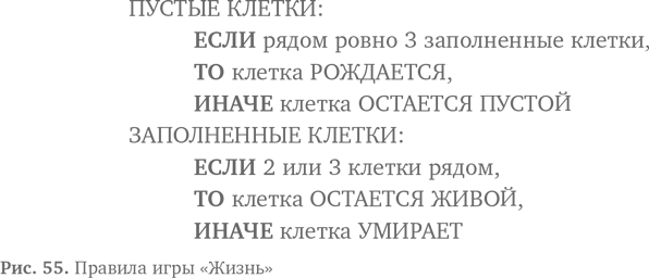 Сетка представляет собой небольшой квадратный мир с клетками (пикселами), которые могут присутствовать (быть живыми) и отсутствовать (быть мертвыми). У каждой клетки есть окружение из восьми других, которые непосредственно прилегают к ней по горизонтали, вертикали и диагонали. Чтобы выжить, существующая живая клетка должна иметь два или три живых соседа — этого достаточно для поддержания жизни, но не слишком много. Если у любой живой клетки окажется менее двух соседних, она умрет из-за недостаточной населенности. Подобным образом любая живая клетка, у которой более трех живых соседей, умрет от перенаселения. Наконец, каждая живая клетка, у которой есть три живых соседа, активизируется и имитирует процесс размножения. Эти принципы обобщены в порождающих правилах на рис. 55.