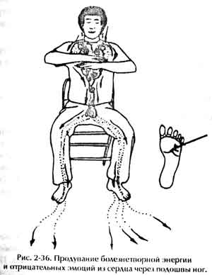Даосы считаклучто подошвы ног и центры ладоней связаны с сердцем. Поэтому продувание болезнетворной энергии включает перемещение се из сердца вниз, к подошвам (рис. 2-36). Согласно теории, болезнетворная энергия выдувается к подошвам ног и дальше в землю; подошвы связаны с Матерью-Землей, которая может принимать, использовать и преобразовывать такие энергии в полезные. Это означает, что, если отрицательная энергия будет выражаться в виде эмоций и "выбрасываться" из сердца па более высоком уровне, Мать-Земля не сможет ее принять и превратить в хорошую энергию. Вместо этого эти эмоции перейдут к тем, с кем вы общаетесь, в результате чего окружающим вас людям тоже могут грозить болезни.