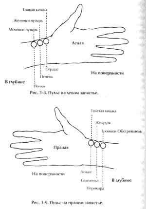 При диагностировании по правой руке (рис. 3-9) указательный палец, находящийся рядом со сгибом кисти, при слабом надавливании определяет состояние толстой кишки, при более сильном - состояние легких.