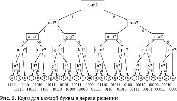 Дерево решений представляет собой совсем другой подход. Если мы примем «да» и «нет» или «моргнуть» и «не моргать» за 1 и 0, тогда дерево решений определит двоичную последовательность, которую должен усвоить больной с синдромом «запертого человека», чтобы обозначить каждую букву (рис. 3).