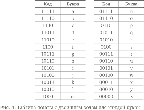 Таким образом, чтобы ускорить процесс, можно отказаться от вопросов. Человек, передающий информацию, проходит определенную последовательность для каждой буквы, а другой человек — записывает. Таким образом, обозначая морганием код 0110 (не моргать, моргнуть, моргнуть, не моргать), выражаем букву «P». Соответственно, дерево решений преображаем в таблицу поиска, как на рис. 4. Тому, кто хочет общаться с больным, можно дать либо дерево решений, либо такую таблицу. В сущности, мы только что изобрели код для общения, похожий на азбуку Морзе. И снова очевидно, что наша задача, в сущности, аналогична той, которую пытался решить Сэмюэл Морзе, чтобы передавать информацию с помощью телеграфа. Точки и тире соответствуют нашем единицам и нулям или вариантам «моргнуть» и «не моргнуть». И снова мы применяем обобщение.