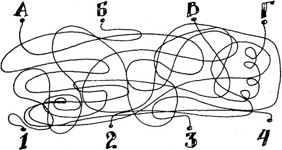 Это упражнение хорошо знакомо вам с детства. Тем не менее оно является отличным средством развить свою способность к длительному сосредоточению. Посмотрите на рисунок 4. Вам надо определить, с какой буквой соединена какая цифра. Но вы должны прослеживать путь от цифры к букве только глазами, без применения пальца, ручки и т.п. В приложении вы сможете найти ещё одну подобную, но более сложную картинку.
