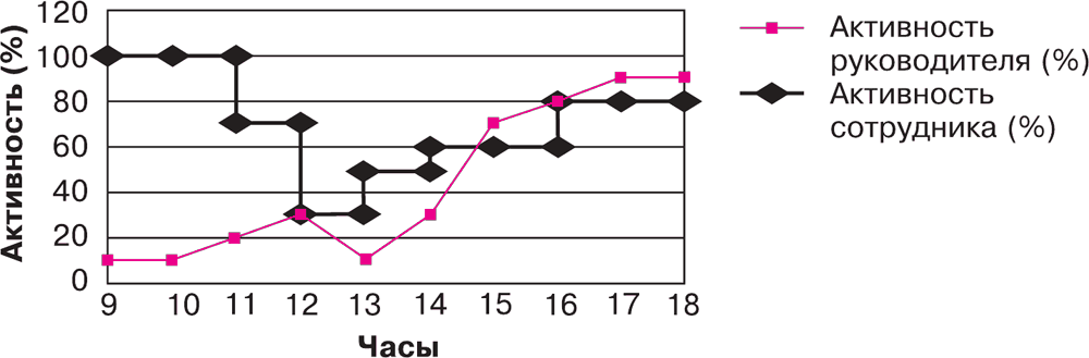 На графике видна активность босса и сотрудника. Босс – жаворонок, сотрудник – сова. Формально хронологическое время – восемь часов.