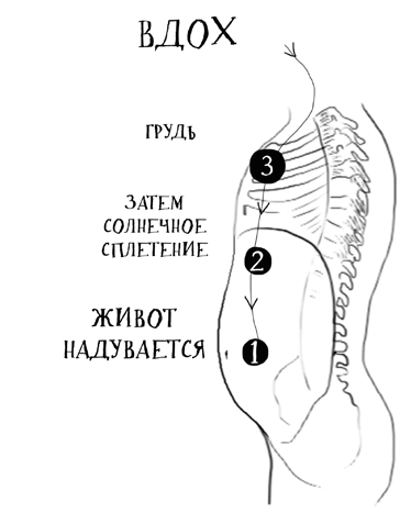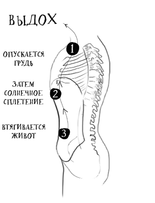 Полноценное дыхание — трехуровневое: живот, солнечное сплетение, грудь — именно в такой последовательности кислород должен нас наполнять и в обратной последовательности углекислый газ должен из нас выходить. При этом наиболее качественным дыхание получается, если вдох делать носом, а выдох ртом.