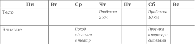 Техника «2?2» направлена на осознанный контроль всех четырех элементов. Суть ее проста: вам нужно составить недельный план действий по двум темам — тело и близкие. План действий по телу включает две спортивные тренировки в неделю с контролем дыхания и питания в эти дни. План действий по близким: два события в неделю, направленные на развитие отношений с близкими (совместный поход в музей, тематическое застолье и др.).