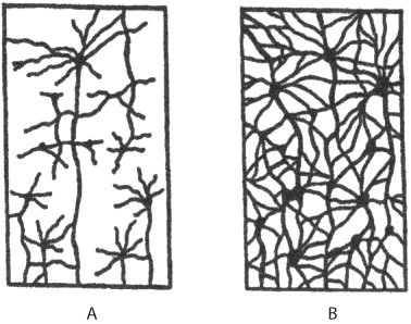Концепции сочетаются, подобно световым лучам, собираются в одной точке и «щелкают» у вас в подсознании. На рисунке А – это отражение связей клеток мозга среднего человека, работающего над проблемой, а В – отражение связей клеток мозга, постоянно стимулируемых записью и анализом информации.