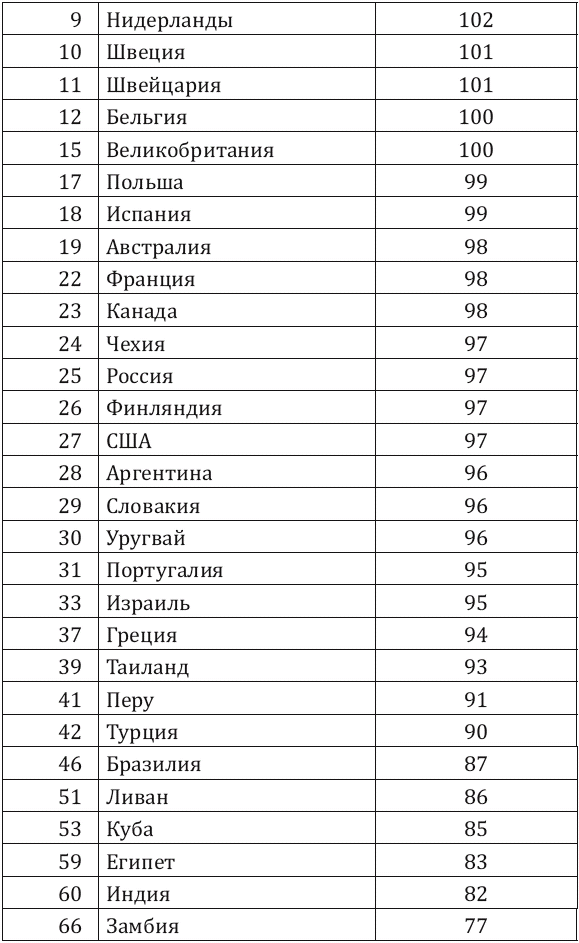 В книге приведена таблица среднего показателя IQ для 81 страны мира. Вот некоторые данные из этой таблицы