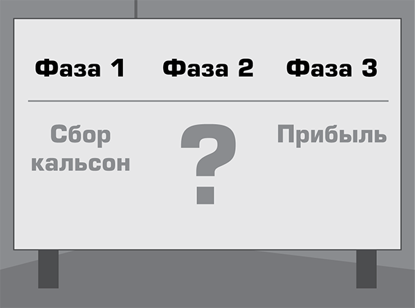 Когда после этого неизбежно следует вопрос: «А в чем состоит вторая?» – гном говорит: «Фаза третья – это прибыль!» Итак, они знают, что сбор кальсон – первая фаза, а третья фаза – прибыль. Где же вторая? Гномы сверяются со своим бизнес-планом, и оказывается, что вторая фаза – это всего лишь гигантский знак вопроса. И вместо того чтобы выяснить, в чем она состоит, гномы проводят день и ночь, трудолюбиво собирая кальсоны – и не имея ни малейшего понятия, как перейти ко второй фазе. Которая, по плану, должна привести их к желанной третьей фазе.