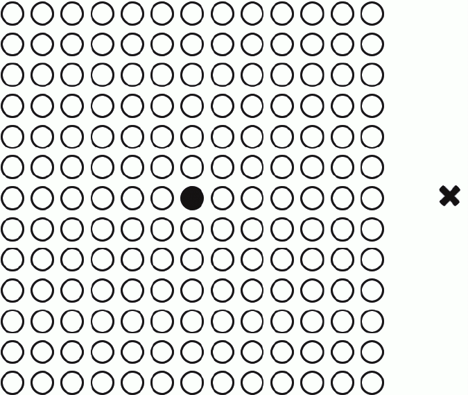 Закройте ладонью правый глаз и приблизьте лицо к приведённому ниже рисунку. Смотрите левым глазом на крестик справа. Не отрывая взгляда от крестика, медленно удаляйте лицо от рисунка. В какой-то момент чёрный кружочек посреди белых перестанет быть виден. Всё будет выглядеть так, как будто его среди них нет, хотя он остаётся на своём месте, о чём вы прекрасно знаете. По сути, вы смо'трите на чёрный кружочек, знаете, что он там есть, но его не видите. Хотя, казалось бы, ничто увидеть не мешает. А всё слепое пятно в глазу.