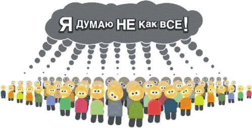 Данное изображение льстит самолюбию лоха. Лоху кажется, будто он критически смотрит на толпу со стороны. Именно со стороны. На толпу, в которой сам не присутствует. Картинка представляется ему меткой сатирой на множество людей, которая лично к нему не относится. Из незамысловатого рисунка подспудно сочится смысл: «Какие же они все лохи!» Лох довольно хихикает. Ему кажется, что раз он над рисунком смеётся, значит, сам он точно не такой (из чего прямо следует, что именно такой и есть, но до этого логичного вывода лох свою мысль предусмотрительно не доводит). А ещё лоху кажется, будто над многочисленными лохами он посмеялся вместе с автором рисунка. Только на самом деле автор поржал над ним лично и над тем, как лох над этим изображением смеётся, а смеясь, продолжает оставаться ровно таким, как нарисовано на картинке. То есть над непроходимостью лошиного лоховства. Ибо какой же лох согласится: «Я думаю как все»? Это равнозначно согласию «Я лох». Так что если какие-то лохи согласятся, то смотрите о них выше абзац про галошу.
