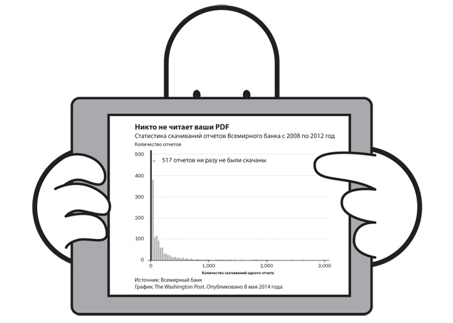 Тревожная статистика, скажу я вам. Washington Post справедливо заметила, что такова статистика не только Всемирного банка. Важные отчеты публикуются в разных сферах: государственной власти, науке, праве, банковском деле, страховании. Сотни тысяч страниц потенциально важной ценной информации. В их производство инвестировано несчетное количество человеко-часов. А их даже не открывают?