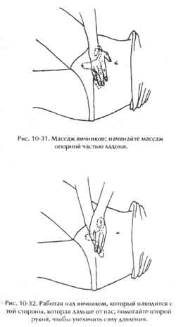 с. Эта техника работает лучше, если ее выполняет другой человек, и результат достигается быстрее, чем при работе с каждой стороны поочередно. Тем не менее вам следует научить свою ученицу, как работать над собой дома, чтобы поддерживать достигнутые ранее результаты (рис. 10-33). Если она не будет работать дома, яичники через несколько дней вернутся в первоначальное состояние. Они привыкли находиться на этом месте и будут стремиться туда вернуться, следуя старым привычкам. Дайте им почувствовать себя удобно в новом положении.