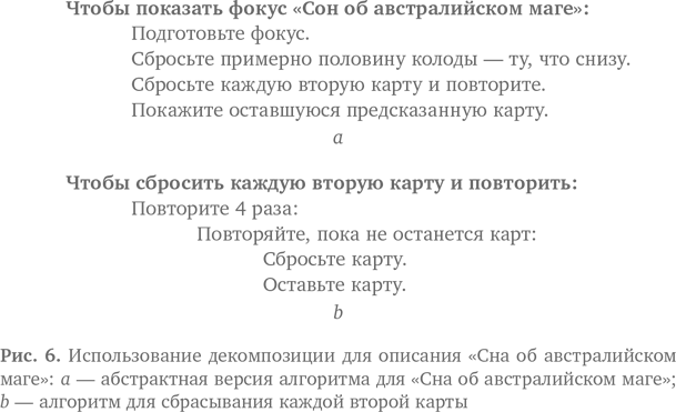 Чтобы придумать фокус, например можно составить его из частей, отдельно поработав над каждым шагом и его представлением. Здесь мы снова наблюдаем вычислительное мышление в действии, а именно — декомпозицию. Фокус «Сон об австралийском маге» состоит из четырех основных шагов. Во-первых, нужно подготовить колоду, поместив карты на известные позиции. Во-вторых, нужно сбросить нижнюю часть колоды, создав у добровольца ощущение, что он сам выбирает, как ее поделить, от чего зависит результат (хотя это не так). Следующий шаг — раскладывать карты так, чтобы в итоге осталась одна. И последний шаг — раскрыть предсказание. Если мы запишем фокус в виде алгоритма на этом уровне детализации, то получим что-то вроде изображенного на рис. 6а.