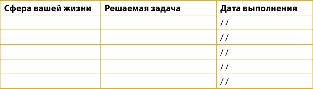 Используя нижеприведенную таблицу в качестве шаблона, опишите, какие задачи вам стоит решить, чтобы в таблице «Оценка вашей зоны комфорта» повысить показатели там, где они составляют 6 и меньше. В правой колонке обозначьте для себя дату выполнения задач.