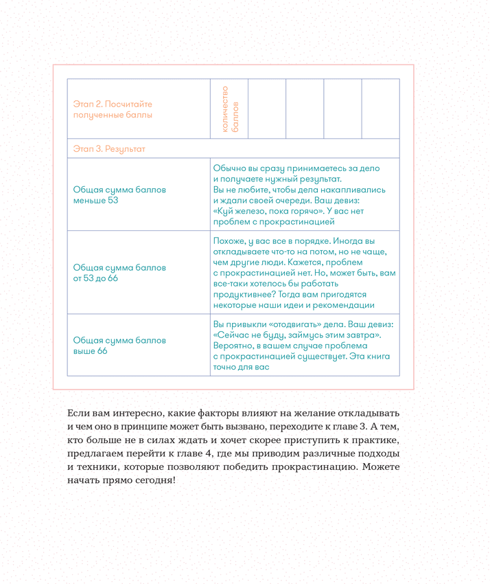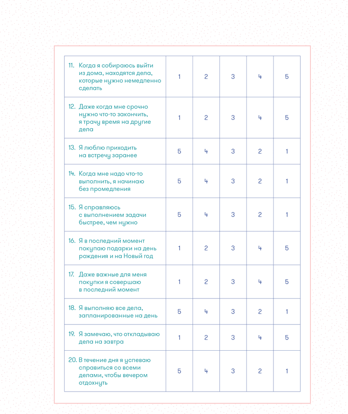 Сколько неприятностей приносит вам привычка откладывать важные дела? Пройдите тест[3], и вы увидите реальную картину происходящего. Это переработанный вариант широко распространенного американского теста «Шкала прокрастинации». Изначально опросник был составлен канадским психологом Клэрри Лэй, которая изучала уровень прокрастинации у канадских и американских студентов. Мы адаптировали его на выборке 2088 студентов голландских университетов с гуманитарным уклоном.