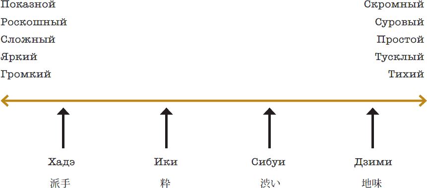 Дзими (??). В буквальном смысле это «земной вкус» – трезвый, консервативный, ненавязчивый. Нейтральные, бежевые, пыльно-серые тона. Если присутствует рисунок или узор, то он будет сдержанным, не контрастным.
