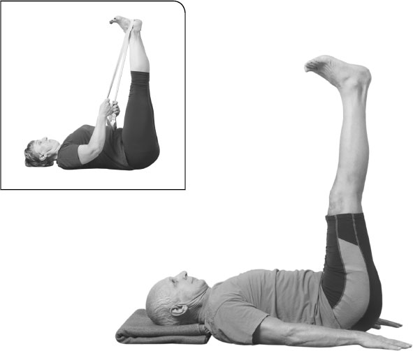Если вы без всяких усилий выполнили эту позу, попробуйте сделать ее в более активном варианте. Для этого лягте на спину в центре комнаты, вытяните руки с двух сторон от туловища. Прижмите ладони к полу. Согните ноги, оторвите их от пола, на выдохе распрямите ноги вверх под прямым углом. Останьтесь в позе 20–30 секунд. Дышите спокойно. Старайтесь не напрягать внутренние органы живота и хорошо вытягивать все тело. На выдохе согните ноги, опустите их на пол и расслабьтесь.