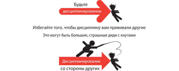 Вывод таков: используйте инструмент самодисциплины, чтобы преодолевать себя на пути к успеху. А если вашему «само» не удается совладать с вами, ищите большого страшного дядю с кнутом, чтобы он вам помог.