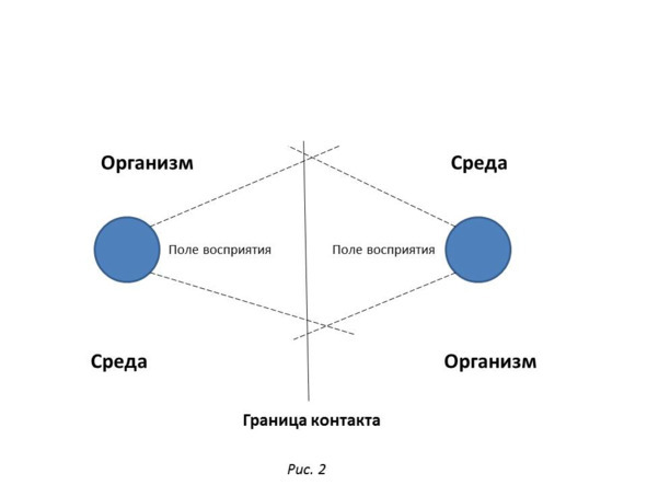 Понятие поле организм/среда в гештальт-терапии имеет в виду, что индивид является и частью своей среды обитания, и одновременно тем, кто воздействует на нее. Вместе они образуют единое целое. Так, например, для хищника в дикой природе ландшафт, растительность, другие животные являются его средой обитания, но с другой стороны, он сам является средой обитания для микроорганизмов, насекомых и других животных. В мире социальных отношений для человека его среду обитания образуют другие люди, а он, в свою очередь, является частью их жизненной среды (рис. 2). Например, для сотрудника, только что устроившегося на предприятие, работающие на нем люди, будут восприниматься как элементы его новой рабочей среды, а он с их стороны, как новый элемент среды, к которой они уже привыкли.