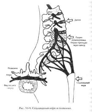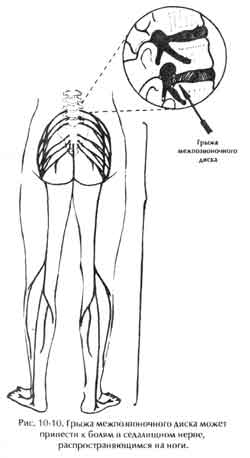 c. Ответвления седалищного нерва выходят из позвоночника в области крестца. Если седалищный нерв раздражен, это может приводить к болям в спине и в ногах (рис. 10-10). Причиной его раздражения может быть грыжа межпозвоночных дисков, проблемы в крестцово-подвздошном соединении, а также уплотнение тканей и застой в окружающих его связках и мышцах. Снять эту боль можно с помощью глубокого массажа крестца, а также путем надавливания и массирования различных участков тела, расположенных вблизи седалищного нерва.