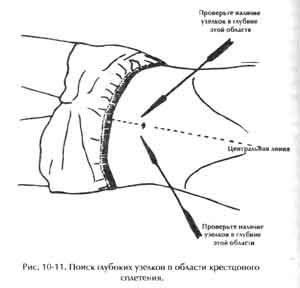 d. Прочувствуйте узелки, припухлости или сплетения в области нижней части спины (рис. 10-11). Промассируйте их (рис. 10-12)