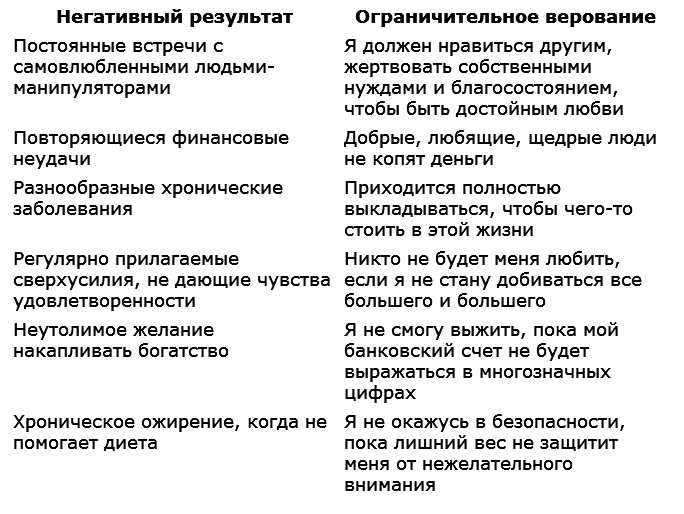 Вот несколько примеров ограничительных верований, предрасполагающих вас к результатам, которых вы хотели бы избежать, но не можете.