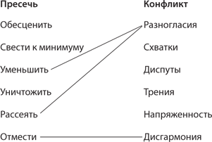 Подумайте над следующими сочетаниями: «рассеять разногласия» намекает на то, что можно минимизировать контакты между этими подразделениями; «уменьшить разногласия» наводит на идею понизить оценку производительности подразделений, пока конфликт не исчезнет; «отмести дисгармонию» предполагает игнорирование конфликта в надежде на то, что он выдохнется сам собой.
