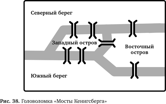 Вот еще одна головоломка, над которой стоит поразмыслить. На рис. 38 показана карта города с рекой, протекающей через него, двумя островами и семью мостами через реку.