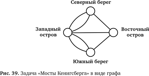 Вычислительное мышление подразумевает умение мыслить логически. Хорошее представление информации помогает в этом, потому что позволяет убрать ненужное и сосредоточиться на главном. Именно это и обнаружил Леонард Эйлер, когда решал задачу «Мосты Кенигсберга» и пришел к мысли нарисовать граф (рис. 39). Граф помог ему увидеть задачу предельно ясно.