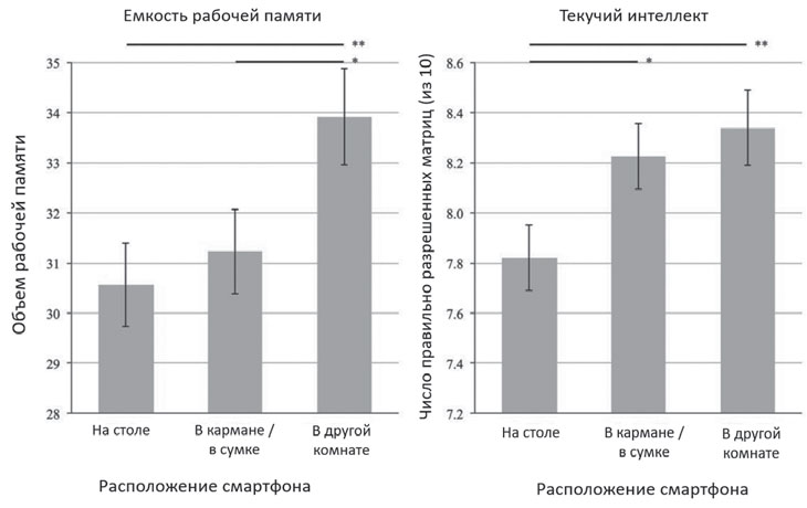 Рис. 64. Влияние расположения смартфона на емкость рабочей памяти и текучий интеллект[45]