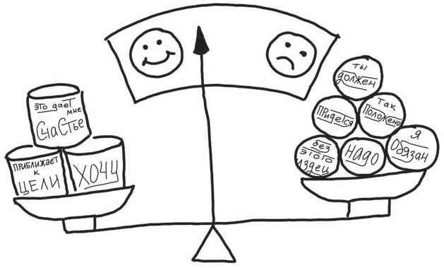 Подумайте о своей хотелке. Если при мысли о ней в голове всплывают слова «надо», «должен», «давно пора» — наверное, это не ваше. А еще приглядитесь к тому, что происходит с вашим телом. Вы расслабляетесь, и на лице появляется улыбка? Или голова вжимается в плечи и напрягаются челюстные мышцы? Зачастую тело дает куда более точный ответ, чем сознание. Как мы увидим позже — это еще очень большой вопрос, кто на самом деле самый рациональный у нас в голове…