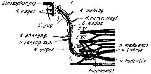 Рис. № 12. Анастомоз центрального отрезка блуждающего нерва с корешками плечевого сплетения, иннервирующими кожу и мышцы передней конечности (рисунок из работы П. К. Анохина)