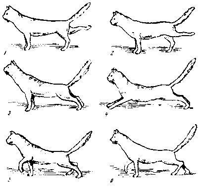 Рис. № 13. Стадии нарушения координации хождения у кошки после пересадки части разгибательной мышцы сгибательное положение