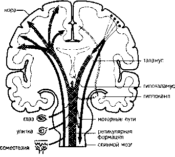 От рецепторов (глаз, улитка, сома) информация отправляется и в подкорку, и в подведомственные им отделы коры головного мозга, а какая-то часть изначального импульса направляется к клеткам ретикулярной формации.