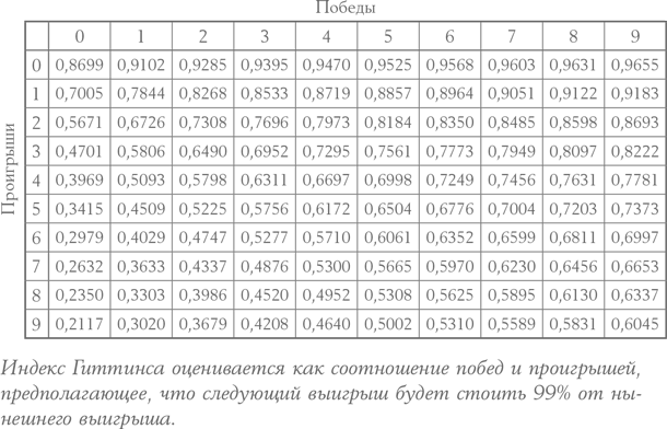 Глядя на таблицу значений индекса Гиттинса, можно отметить несколько интересных моментов. Во-первых, наглядно показано, как работает принцип «оставайся победителем»: в любой строке слева направо значение индекса возрастает. То есть если вы выбрали автомат, дернули за рычаг и получили выигрыш, то (согласно таблице) имеет смысл снова дергать именно его. Во-вторых, можно увидеть, в каких случаях принцип «проиграл – переключись» может вас подвести. Девять выигрышей подряд и следующий за ними проигрыш дадут индекс 0,8695, который выше других значений в таблице, и, таким образом, вам нужно оставаться у этого автомата по меньшей мере еще на одну игру.