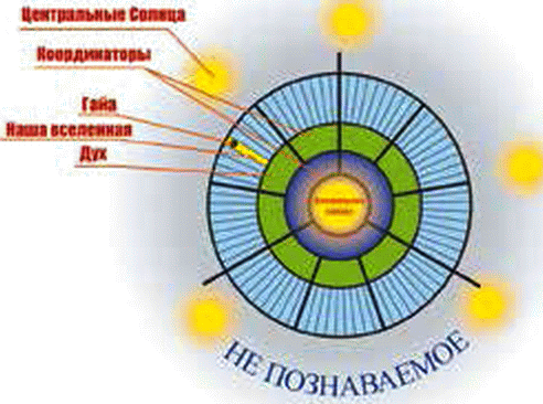 Теперь представим себе некоторую центральную область в этом конгломерате. Данную область можно назвать Центральным Солнцем. Во всех участках Конгломерата присутствуют энергии Центрального Солнца и любая энергия в любой Вселенной этого шара доступна для общения с ним. Следующий уровень управления имеет три области, каждая из которых доступна всем участкам, находящимся в их ведении. Любая из вышеуказанных областей обеспечивает взаимодействие с тремя последующими уровнями, контактирующими с девятью Вселенными каждая. В одной из Вселенных находится Гайя – Земля. Данную структуру можно изобразить на вышеприведённом рисунке.