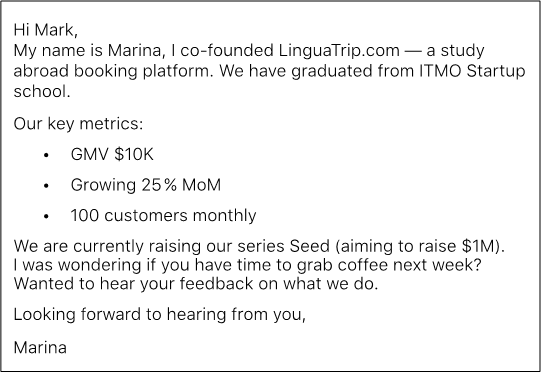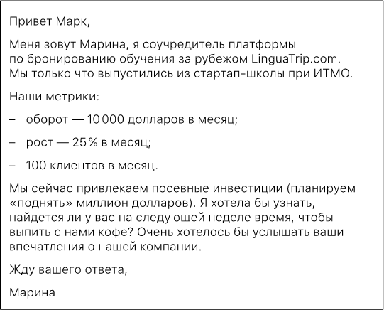 • почему вы пишете это письмо (очень лаконично, помните, у вас всего 11 секунд внимания получателя);