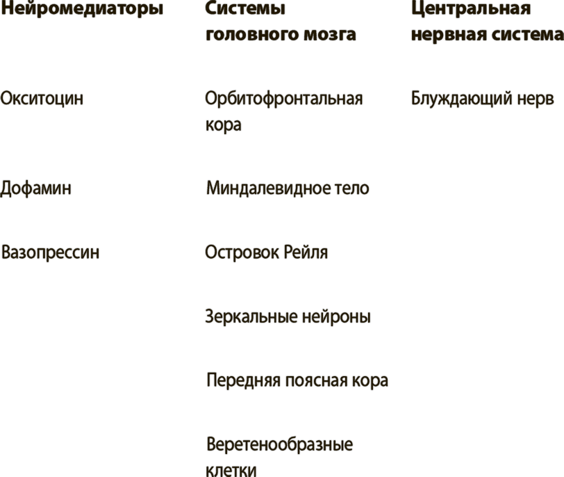Кроме орбитофронтальной коры, социальные взаимоотношения важны для зеркальных нейронов и передней поясной коры. Например, еще одна важная составляющая головного мозга – это островок Рейля. Его невозможно увидеть, так как он располагается внутри коры головного мозга. Островок Рейля участвует в формировании многих социальных эмоций, в том числе любви и неприятия. К системам социального мозга относятся следующие.