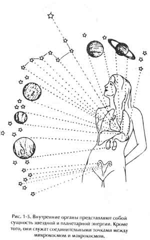 Первой силой Природы является Энергия Универсума, которая также называется Энергией Неба. Она проявляет себя как энергия звезд, планет и галактик. Эта огромная, все заполняющая сила питает ум, душу и дух каждого индивидуума и всего, что есть во Вселенной. Органы человеческого тела созданы звездной и планетной энергией и являются связующими точками между микрокосмом и макрокосмом (рис. 1-5).