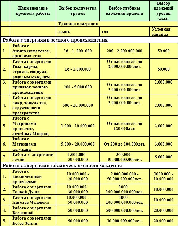 В данной таблице приведены ориентировочные уровни вложения Матриц. Как вы понимаете, чётких установок на этот предмет нет, и быть не может. Это связано не только с древностью отрабатываемых энергий, но и с возрастом не только Земли, но и Тонкой Души. Именно этим объясняется то обстоятельство, что в методике применены, в большинстве случаев такие большие уровни. Данная информация порождена тем статистическим опытом, который вынес автор в результате своей работы. Вы можете экспериментировать с ними как угодно, и это не приведёт вас, в конечном итоге, к проблемам физического тела, однако данные эксперименты помогут Вам понять, как много правды в работе с энергиями. Эффективность работы в Матрицах, как и в прямом пространстве, конечно же, зависит и от Вашей энергетической чистоты. Чем вы чище, тем эффективней работа, и тем значимее результаты на физическом и социальном плане, ведь Матрицы помогают привести в гармонию не только физическое тело, но и внешние взаимосвязи Человека. Любого. Главное – начать работать, то есть, выкроить из своего напряжённого графика сколько-то времени и для этого, внешне странного, занятия.
