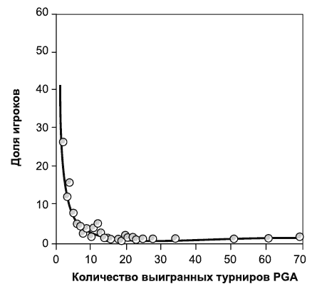 Знаменитый социолог Чарльз Мюррей в своем объемном трактате Human Accomplishment {26} начинает разговор о достижениях со спорта. Сколько турниров Профессиональной ассоциации гольфа США (PGA) выигрывает средний профессиональный игрок в гольф за свою жизнь? Среднее число находится между нулем и единицей. (Мода, то есть наиболее часто встречающееся значение, равна нулю.) Но четыре гольфиста выиграли тридцать турниров и более, Арнольд Палмер победил в шестьдесят одном, а Джек Никлаус – в семидесяти одном (как и Тайгер Вудс на момент написания этой книги). Форма графика распределения количества турниров PGA, выигранных одним игроком, даже отдаленно не напоминает колокол, скорее это вогнутая кривая, сильно смещенная влево (напоминает горный утес).